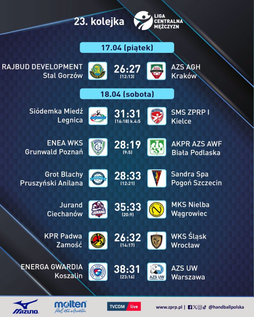23. kolejka Ligi Centralnej Mężczyzn dostarczyła kibicom pełnego wachlarza emocji – od jednostronnych widowisk po dramatyczne rozstrzygnięcia w rzutach karnych. Czołówka tabeli nie zawiodła, notując pewne zwycięstwa, ale nie zabrakło również spotkań, które trzymały w napięciu do ostatnich sekund. Szczególną uwagę przyciągnął mecz w Legnicy oraz zacięta rywalizacja w Ciechanowie. Oto szczegółowe podsumowanie wszystkich spotkań.